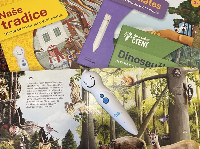 Je to snadné. Plastová silná tužka se přiloží na list knížky a podle nastaveného programu tužka mluví.