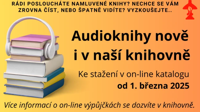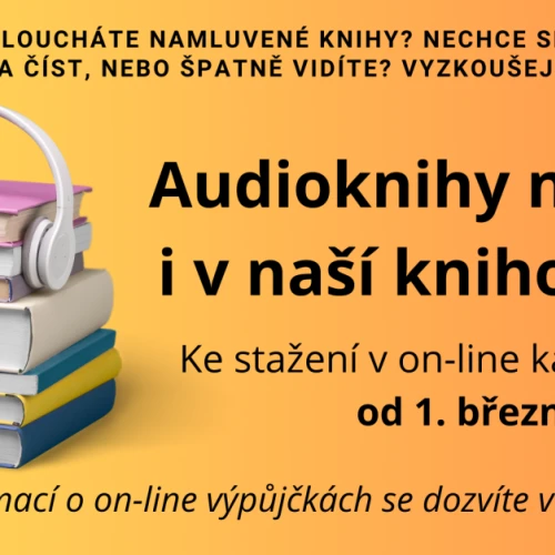 Od 1. března 2025 spouštíme zcela novou atraktivní službu – půjčování audioknih on-line, kterou jsme pro Vás připravili ve spolupráci s portálem Palmknihy.cz. Tuto službu mohou využít všichni registrovaní čtenáři knihovny zdarma a audioknihy si půjčovat on-line. Jednoduše se vám stáhnou do vašeho mobilního zařízení. Pokud znáte naše e-knihy, nebude pro Vás tato služba žádnou novinkou, e-výpůjčka audioknih totiž probíhá úplně stejně.