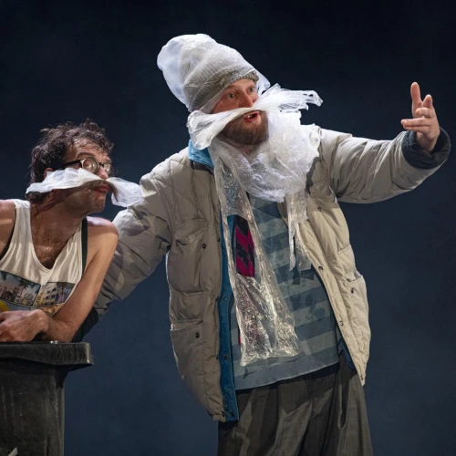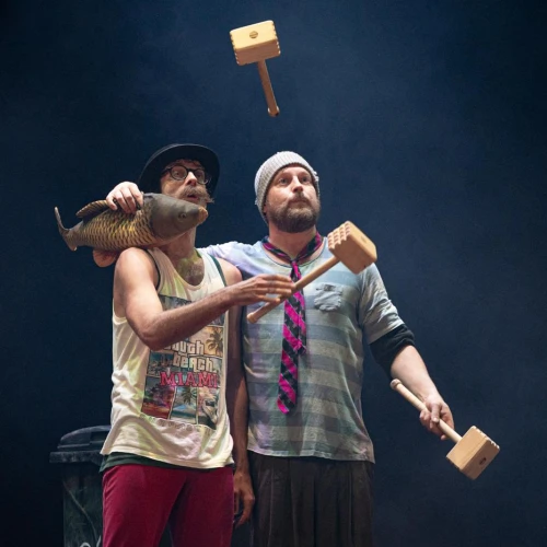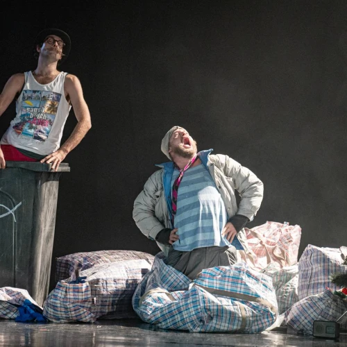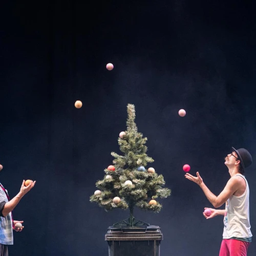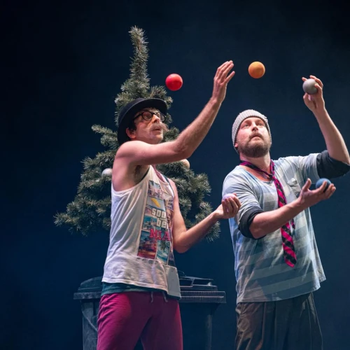 Vánoční groteska s prvky absurdity. Dva bezdomovci na ulici, dva pastýři na cestě do Betléma, dva Bratři v tricku v nové inscenaci! K tomu vytříbená žonglérská technika, humor a nadsázka, značná dávka absurdity i špetka vánoční nostalgie. Ke kouzlu Vánoc už schází jen popelnice, hromada tašek a … KAPR!